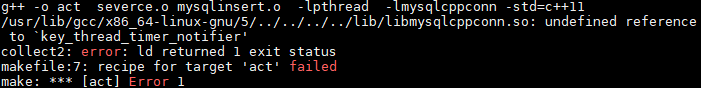 一天后,我又在两台云服务器上进行了安装,但是中间都遇到了很多坑。一台是阿里云,安装的系统是centos7 所安装的软件非常地老旧,cmake只有2.8,需要自己下载源码,编译高版本的cmake。centos的安装命令与ubuntu不同,需要小心。另一台是天翼云的云服务器,使用的是ubuntu1604.这两台安装过程中,都遇到了一个坑,在我完成connector c++的编译之后,再去编译我编写的应用程序时,链接的时候报错: