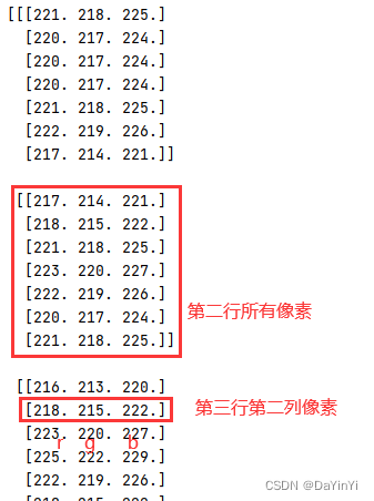 数组中第一层元素为图像的每一行像素,第二层元素为每一列像素,最后一层元素为每一个通道的像素值,它将图片中的每一个像素作为描述单元,记录它三个通道的像素值。