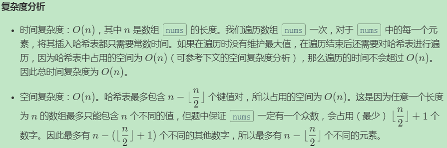我们使用哈希映射(HashMap)来存储每个元素以及出现的次数。对于哈希映射中的每个键值对,键表示一个元素,值表示该元素出现的次数。我们用一个循环遍历数组 nums 并将数组中的每个元素加入哈希映射中。在这之后,我们遍历哈希映射中的所有键值对,返回值最大的键。我们同样也可以在遍历数组 nums 时候使用打擂台的方法,维护最大的值,这样省去了最后对哈希映射的遍历。