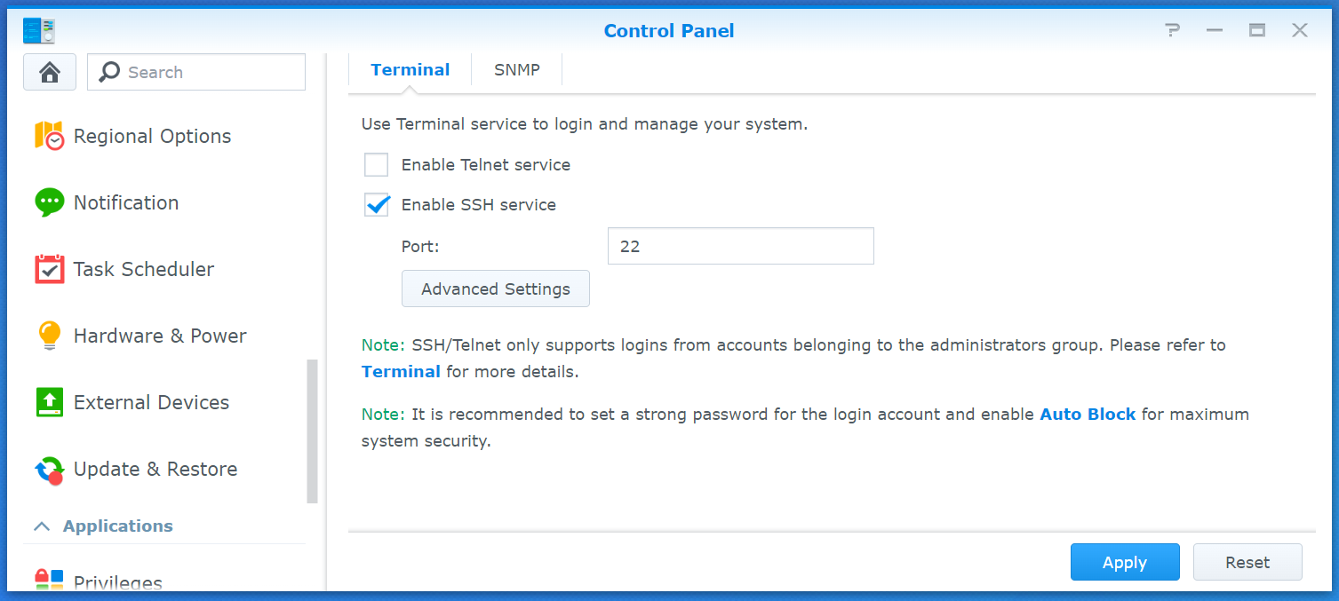 请注意: 上图很清楚的写到 Note: SSH/Telnet only supports logins from accounts belonging to the administrators group. Please refer to Terminal for more details. 注意事项,只有隶属于 administrators 群组的成员才能透过 SSH 连入装置。