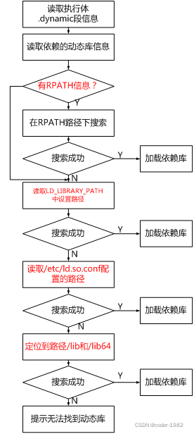 总体来说,就是在加载一个动态库之前会按照ELF文件格式,去读取这个动态库还依赖的动态库,并读取动态库搜索路径(如果这个RPATH存在),并以该搜索路径为起点,依次搜索LD_LIBRARY_PATH,/etc/ld.so.conf中指定的路径,最后到/lib或者/lib64中去搜索,在其中任意一个位置搜索到后完成依赖库的加载后便返回。