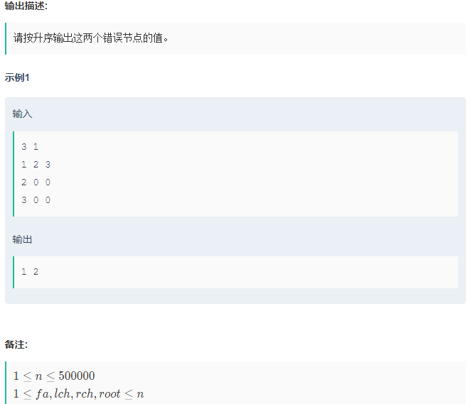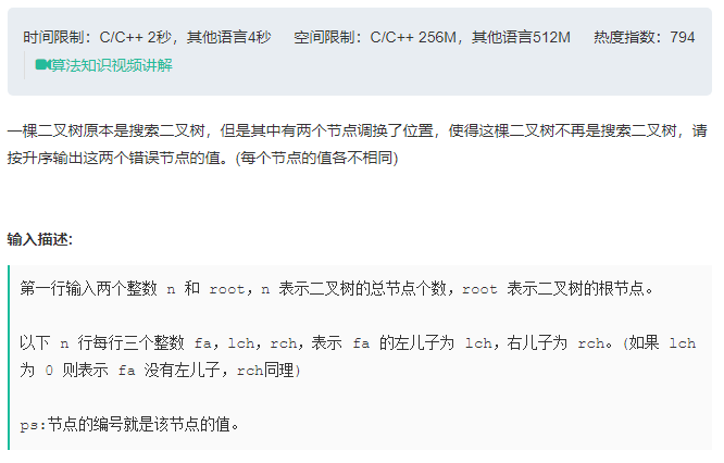 这道题的目标是,让我们找一棵搜索二叉树中,元素放错位置的两个节点的值。因为树中各个节点的值不相等,所以根据搜索二叉树的性质可知,这棵树(元素正确放置)的所有节点的中序遍历结果,一定是一个升序的数组。当数组的元素错放时,我们只需要找出这两个错放的元素位置即可。