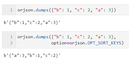 通过配合参数option=orjson.OPT_SORT_KEYS,可以对序列化后的结果自动按照键进行排序: