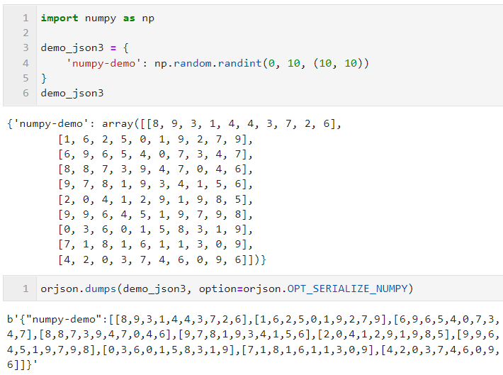 orjson的一大重要特性是其可以将包含numpy中数据结构对象的复杂对象,兼容性地转换为JSON中的数组,配合option=orjson.OPT_SERIALIZE_NUMPY即可: