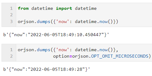 orjson.dumps()可以直接将Python中datetime、time等标准库中的日期时间对象转换成相应的字符串,这是原生json库做不到的,而通过配置option=orjson.OPT_OMIT_MICROSECONDS,可以将转换结果后缀的毫秒部分省略掉: