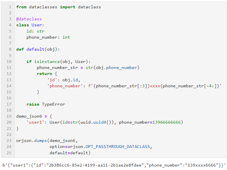 当你需要序列化的对象中涉及到dataclass自定义数据结构时,可以配合orjson.OPT_PASSTHROUGH_DATACLASS,再通过对default参数传入自定义处理函数,来实现更为自由的数据转换逻辑,譬如下面简单的例子中,我们可以利用此特性进行原始数据的脱敏操作: