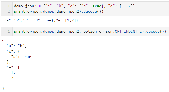 通过配置option=orjson.OPT_INDENT_2,我们可以为序列化后的JSON结果添加2个空格的缩进美化效果,从而弥补其没有参数indent的不足: