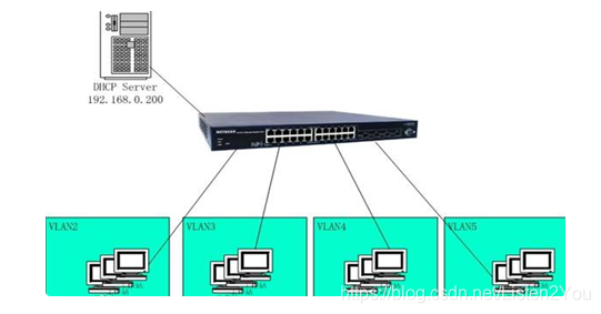 在DHCP客户端看来,DHCP中继代理就像DHCP服务器;在DHCP服务器看来,DHCP中继代理就像DHCP客户端。此外,如果想让一台DHCP服务器建立多个IP域为不同的VLAN或网络都提供DHCP服务,那么就必须要使用DHCP中继的功能。DHCP中继可以使用主机搭建,也可以通过三层交换机来设置,如下图: