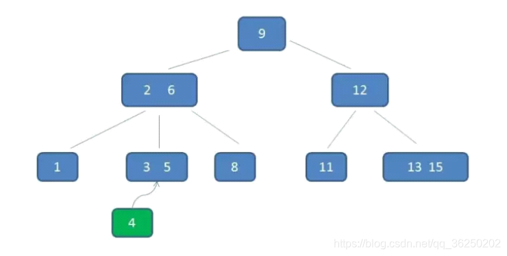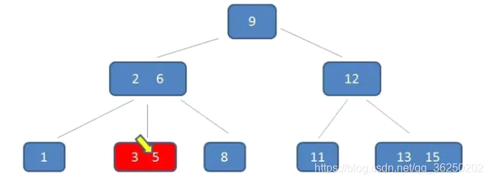 比如向B-树中插入一个4,自顶向下查找4的节点位置,发现4应当插入到节点元素3,5之间。