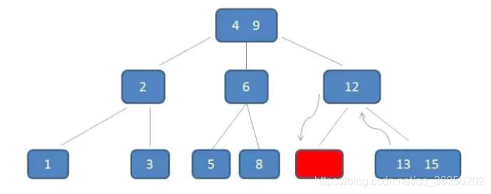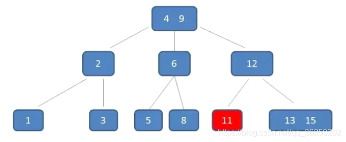 删除11后,节点12只有一个孩子,不符合B树规范。因此找出12,13,15三个节点的中位数