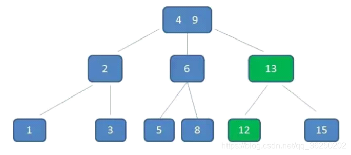 点9升级为两元素节点4,9。节点6独立为根节点的第二个孩子。