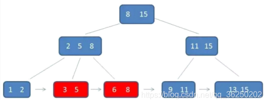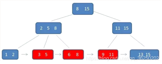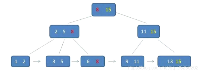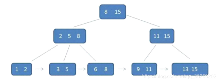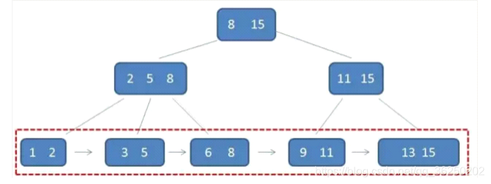 根节点元素8是子节点2,5,8的最大元素,也是叶子节点6,8的最大元素根节点元素15是子节点11,15的最大元素,也是叶子节点13,15的最大元素需要注意的是,根节点的最大元素(15)也是B+树的最大元素,以后无论插入删除多少元素,始终要保持最大元素再根节点中。此外,每个叶节点都带有指向下一个节点的指针,形成了一个有序链表。