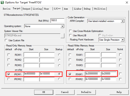 STM32F407的存储设备布局如下图所示,此处使用了MCU内部的iROM & iRAM