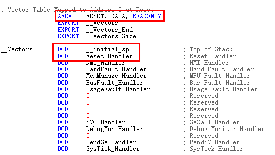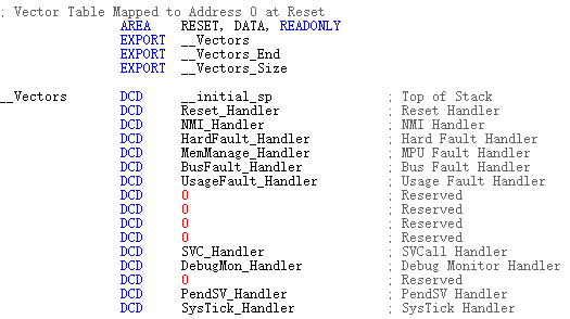 ① __initial_sp为异常向量表的第1个成员,内容为MSP的初始值