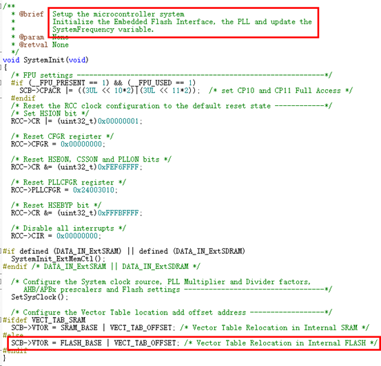 SystemInit函数会设置内置Flash、PLL以及外置DDR(如果有的话),需要注意下该函数对异常向量表地址的重置,即将SCB->VTOR寄存器值设置为FLASH_BASE(0x08000000) | VECT_TAB_OFFSET(0x00000000),也就是IROM1的起始地址