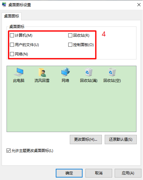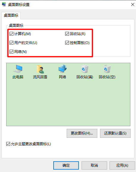 3.重启电脑,右键个性化→主题→桌面图标设置,把复选框全部勾选上,把剪切走的图标剪切回来