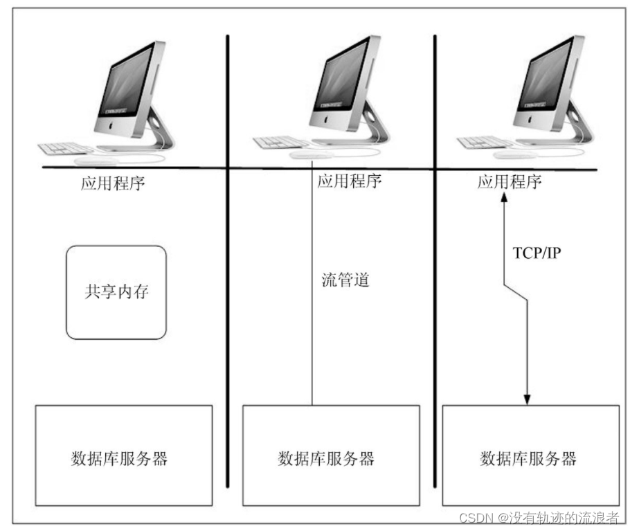 在GBase8s数据库中,如果应用程序和数据库服务器在同一台计算机上,应用程序可以通过三种方式去连接数据库,如图1.1所示。