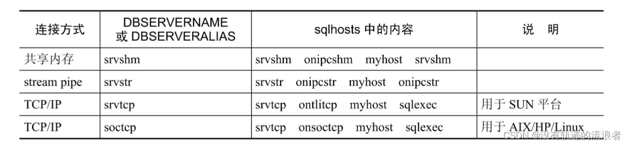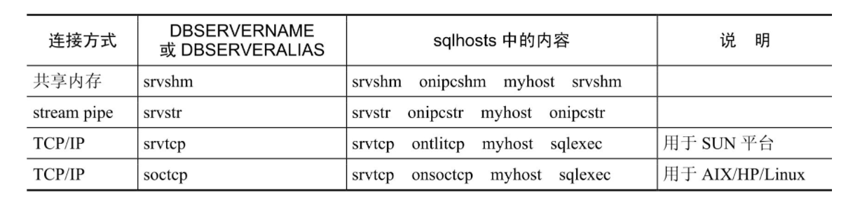当应用程序尝试连接数据库服务器时,需要一些基本的信息,这些信息保存在$GBASEDIR/etc/sqlhosts中,这个文件需要系统管理员手工维护,运行应用程序的用户必须要设置环境变量GBASESERVER,GBASESERVER一般指向sqlhosts中第1列的值(和配置参数文件中的DBSERVERNAME 或者 DBSERVERALIAS 配置值相同), sqlhosts中第1列的值必须是唯一的。keyname 在 sqlhosts 文件中必须是唯一的,并且必须是数据库配置文件中DBSERVERNAME或者DBSERVERALIAS中指定的服务器名。如果客户端和数据库服务器在不同的计算机上,在两台计算机上都需要配置sqlhosts文件。