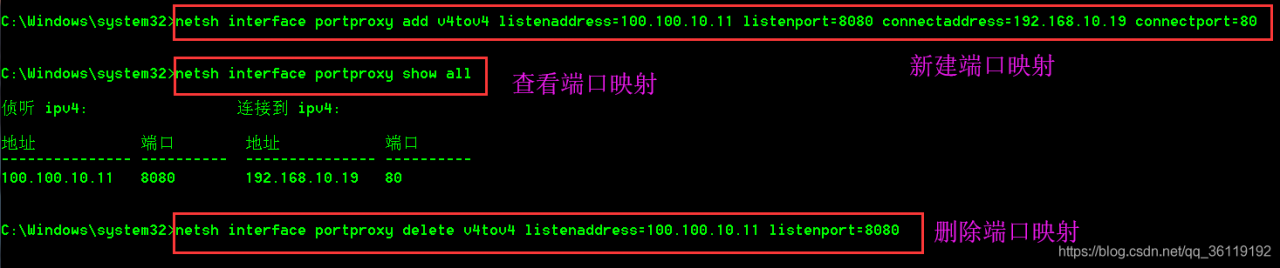 netsh interface portproxy add v4tov4 listenaddress=100.100.10.14 listenport=2222 connectaddress=192.168.10.129 connectport=22 #监听100.100.10.14的2222端口,映射到192.168.10.129 的22端口上