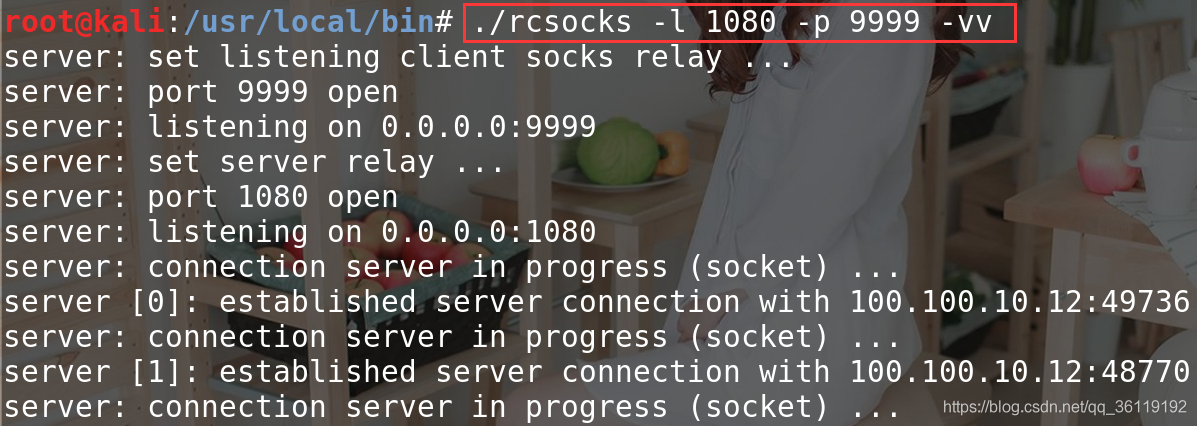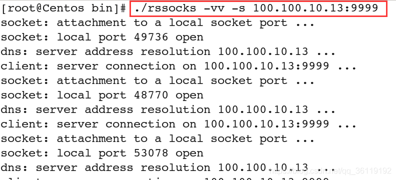 ./rssocks -vv -s 100.100.10.13:9999 #接收100.100.10.13的9999端口的流量