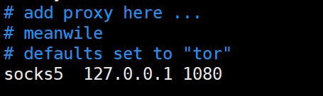 然后配置proxychains代理链的配置文件/etc/proxychains.conf ,将代理设置成本机的