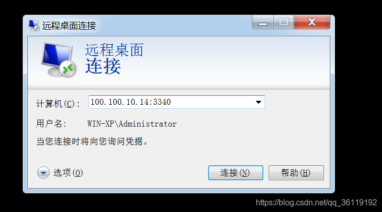 于是,我们远程3389连接公网服务器100.100.10.14的3340端口