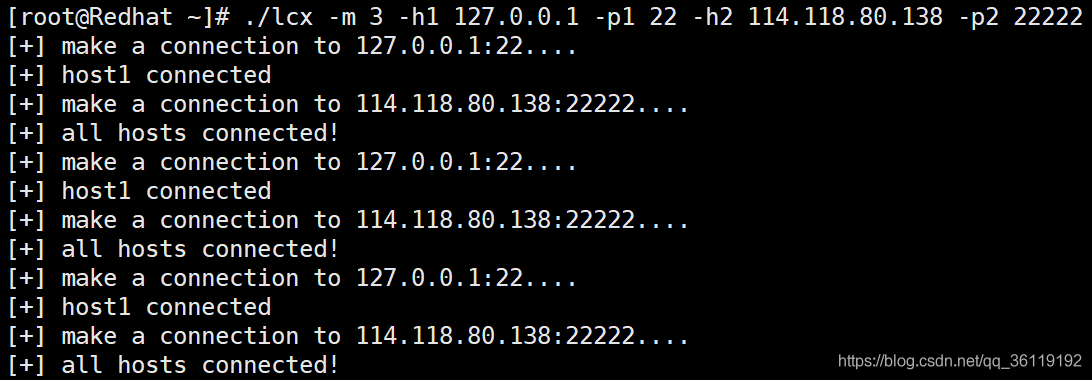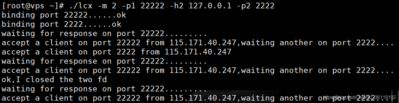 ./lcx -m 3 -h1 127.0.0.1 -p1 22 -h2 114.118.80.138 -p2 22222 #将本地22端口的流量给114.118.80.138的22222端口