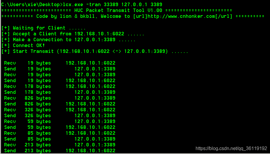 lcx.exe -tran 3340 192.168.10.18 3389 #意思就是将本地的3340端口的流量转发给192.168.10.18主机的3389端口