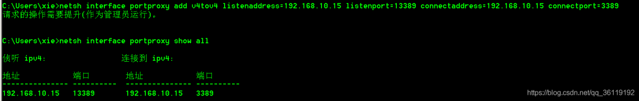 netsh interface portproxy add v4tov4 listenaddress=192.168.10.15 listenport=13389 connectaddress=192.168.10.15 connectport=3389