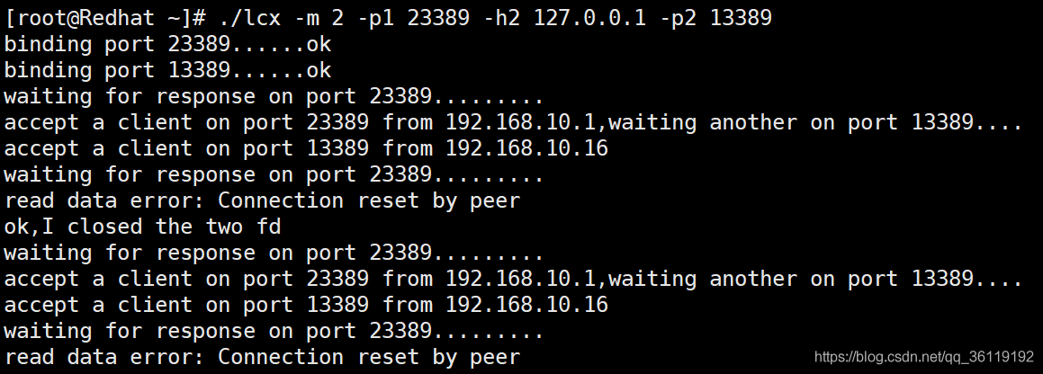 ./lcx -m 2 -p1 23389 -h2 127.0.0.1 -p2 13389 #监听本地23389的流量转发给本地的13389端口,正向代理