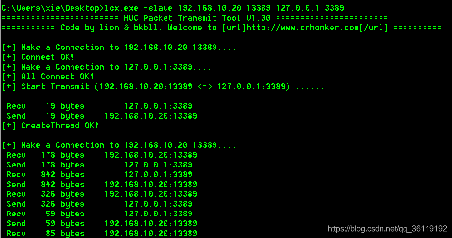 lcx.exe -slave 192.168.10.20 13389 127.0.0.1 3389 #将本地3389端口的流量都转发给192.168.10.20,反向代理