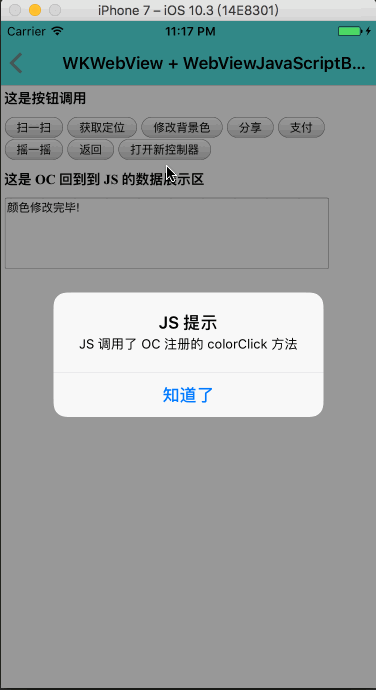 alert("JS 调用了 OC 注册的 colorClick 方法");