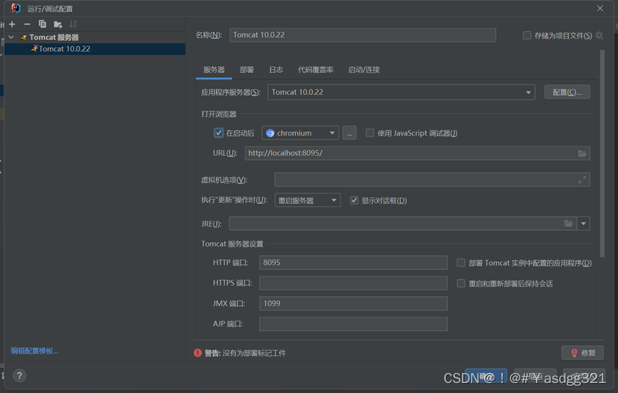 这里因为之前配置过,IDEA存有我的tomcat路径,第一次操作就在配置里把tomcat添加上去,启动后打开的浏览器什么都可以,这里因为准备和日常用浏览器区分开使用,就选择使用的chromium浏览器,HTTP端口这个可以任意填写,IDEA在执行的时候,实际上是虚拟了一个tomcat服务器,可以使用其它端口,所以在IDEA中tomcat服务器运行的时候localhost:8080是无法显示tomcat主页的
