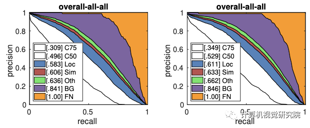 对于所有80个COCO对象类别,在RefineDet(左侧)和新的检测器(右侧)之间进行了误差分析。为了公平比较,两种方法都使用相同的主干(VGG)和输入大小(320×320)进行分析。在此,每个子图像中的图都显示了一系列精确的召回曲线。这些曲线是使用不同的设置计算的。此外,图例中还显示了AUC曲线。