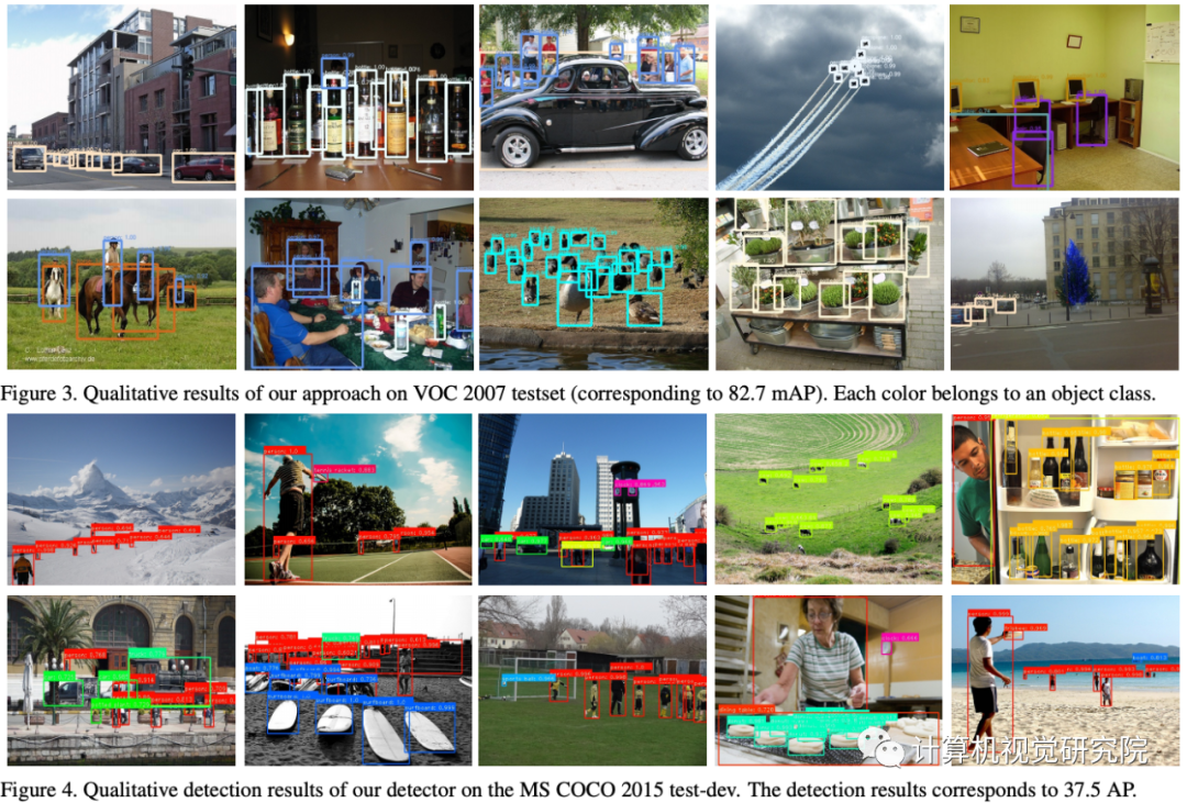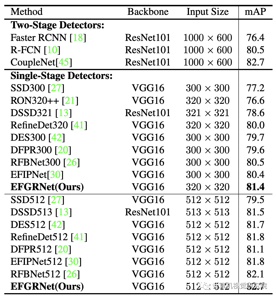 新框架采用在ImageNet上进行预训练的VGG-16作为主干架构。对两个数据集使用相同的设置进行模型初始化和优化。采用warming up策略,将前5个epochs的初始学习速率设置为从10-6到4×10-3。然后,对于150和200 epoch的PASCAL VOC 2007数据集以及90、120和140 epoch的MS COCO数据集,将学习率逐渐降低10倍。