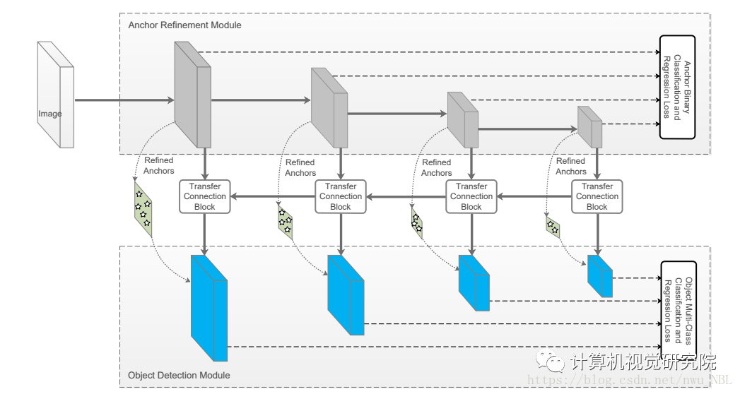 RefineDet的框架结构与SSD有点类似, 总工作流程如下: