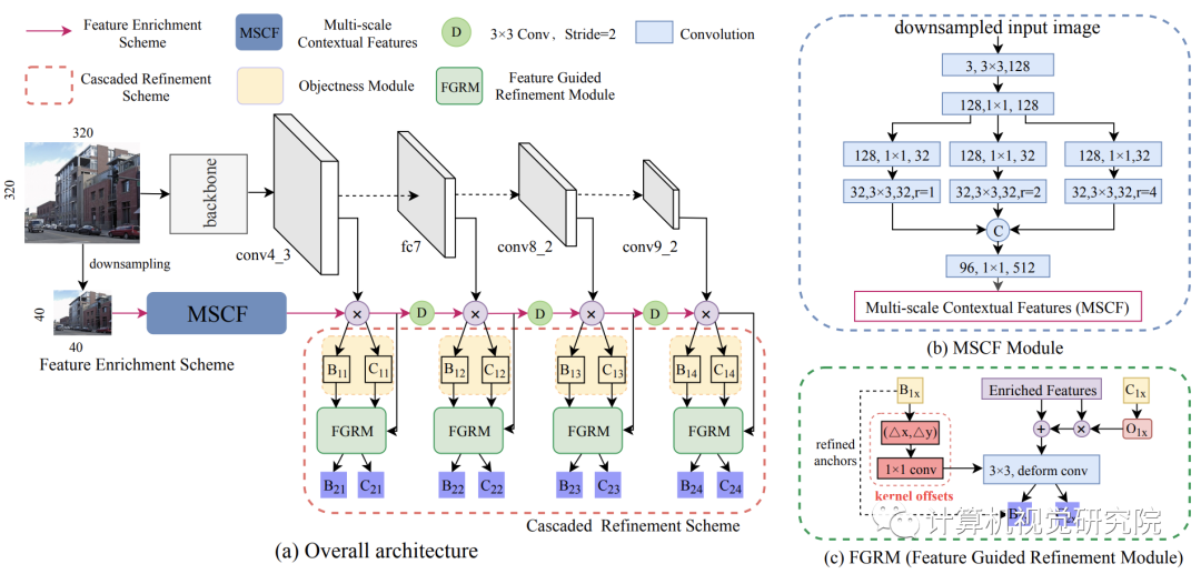 新检测框架由三部分组成:标准SSD层,特征增强(丰富)(FE)方案和级联优化方案。FE方案包含一个多尺度上下文特征模块(MSCF)以解决尺度变化。FE方案产生了多尺度的上下文特征,以提高标准SSD预测层的判别能力。级联优化方案同时利用了多尺度上下文和标准SSD特征,并解决了类不平衡问题。级联优化方案通过分别在两个级联模块(即物体性模块(OM)和特征导向的优化模块(FGRM))中执行框回归和分类来优化anchor和特征。物体性模块(OM)对对象与背景进行二进制分类,并进行初始框回归。然后,FGRM模块重新优化特征和anchor位置,以预测最终的多类别分类和边界框位置。