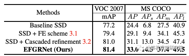 比较在PASCAL VOC 2007和MS COCO minival set数据集上将提出的特征增强和级联的优化方案集成到基准SSD框架中的比较。对于所有实验,主干为VGG16,输入为320×320。最终方法在两个数据集上都比基线SSD的性能有大幅度提高。