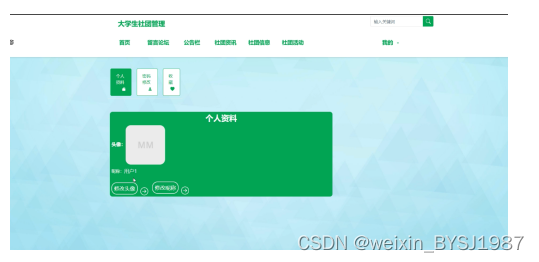 (2)查看大学生社团管理的首页信息:大学生社团管理的首页信息包含了首页、公告栏、留言论坛、社团资讯、社团信息、社团活动、我的(我的账户、我的收藏、个人中心)等。