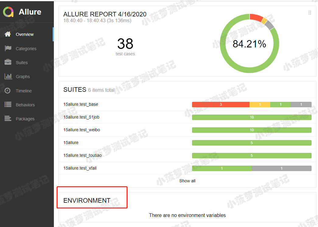 通过创建environment.properties或者environment.xml文件,并把文件存放到allure-results(这个目录是生成最后的html报告之前,生成依赖文件的目录)目录下,就是 --alluredir 后面跟的目录