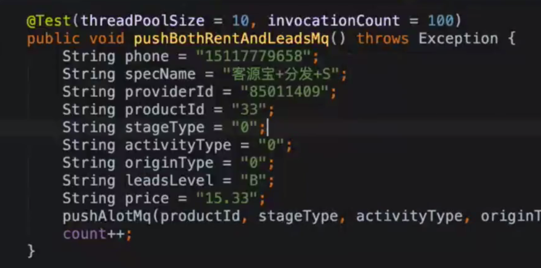 上图是利用TestNG实现并发,效果为10个线程执行100个操作,控制台输出中可以看到前9个的号码都是15100000000,这里就有线程安全的问题,10个线程最开始会同时读取第一个号码资源,读取到的都是15100000000,所以执行的都是这个号码,然后才会递增.那么我们通过干预各线程之间对资源的操作来解决这种问题.