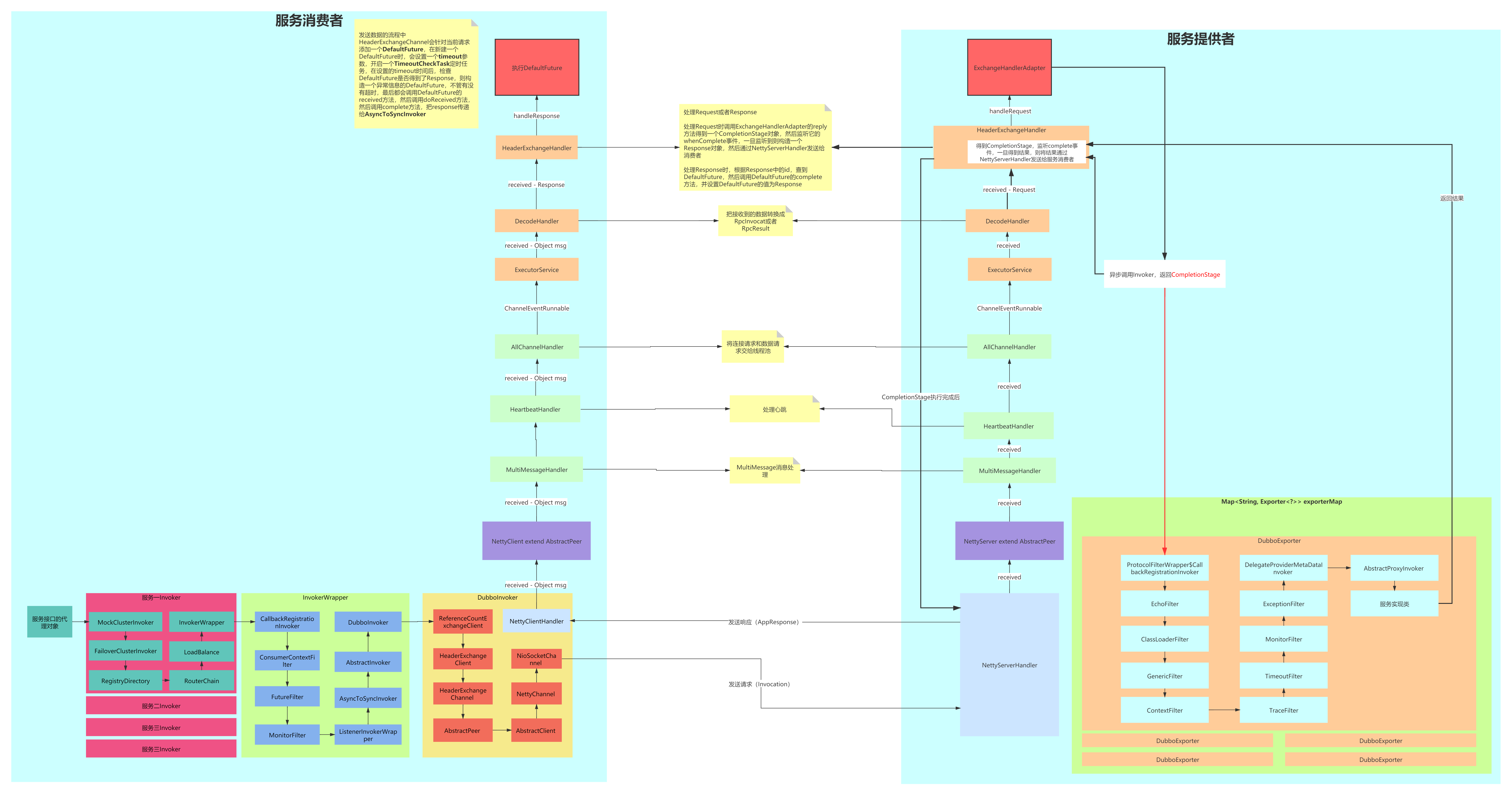 - ExchangeHandlerAdapter:从本机已经导出的Exporter中根据当前Request所对应的服务key,去寻找Exporter对象,从Exporter中得到Invoker,然后执行invoke方法,此Invoker为ProtocolFilterWrapper$CallbackRegistrationInvoker