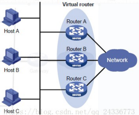 虚拟路由器:虚拟路由器是VRRP备份组中所有路由器的集合,它是一个逻辑概念,并不是正真存在的。从备份组外面看备份组中的路由器,感觉组中的所有路由器就像一个一样,可以理解为在一个组中:主路由器+所有备份路由器=虚拟路由器。虚拟路由器有一个虚拟的IP地址和MAC地址。主机将虚拟路由器当作默认网关。虚拟MAC地址的格式为00-00-5E-00-01-{VRID}。通常情况下,虚拟路由器回应ARP请求使用的是虚拟MAC地址,只有虚拟路由器做特殊配置的时候,才回应接口的真实MAC地址。