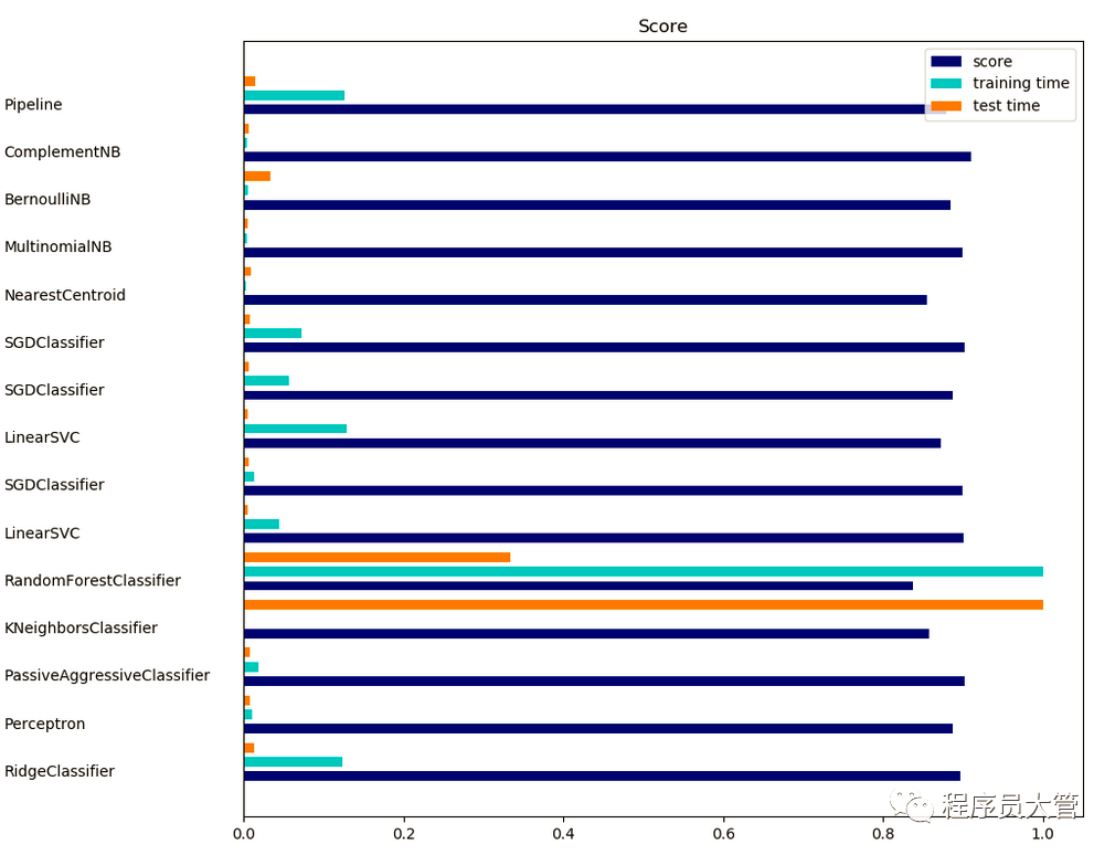 可以看到岭回归分类器的分数比较高,且训练时间短。