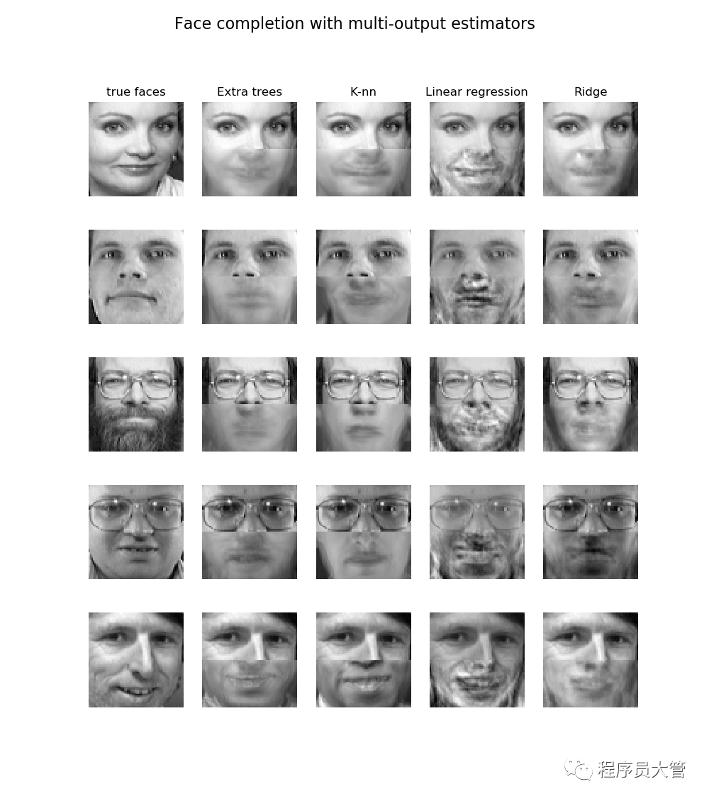 下面分别使用极端随机森林回归、K近邻回归、线性回归、RidgeCV回归来对人脸的下半部分进行预测:
