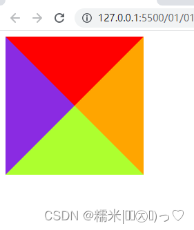 现在咱们得到是一个正方形,但是也能看出来他是由四个三角形拼接而成的,但是咱们要使它变成三角形,就用到一个属性transparent,表示背景透明