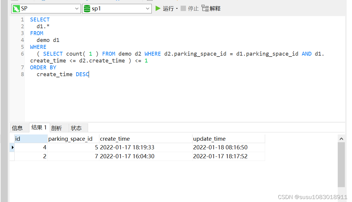 ( SELECT count( 1 ) FROM demo d2 WHERE d2.parking_space_id = d1.parking_space_id AND d1.create_time <= d2.create_time ) <= 1