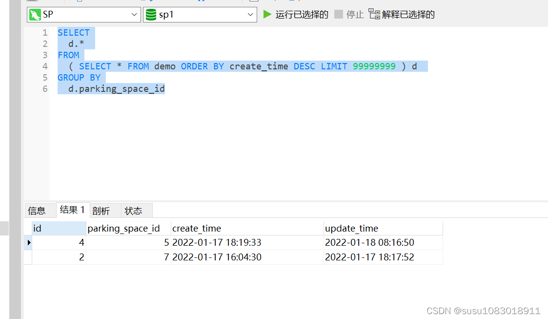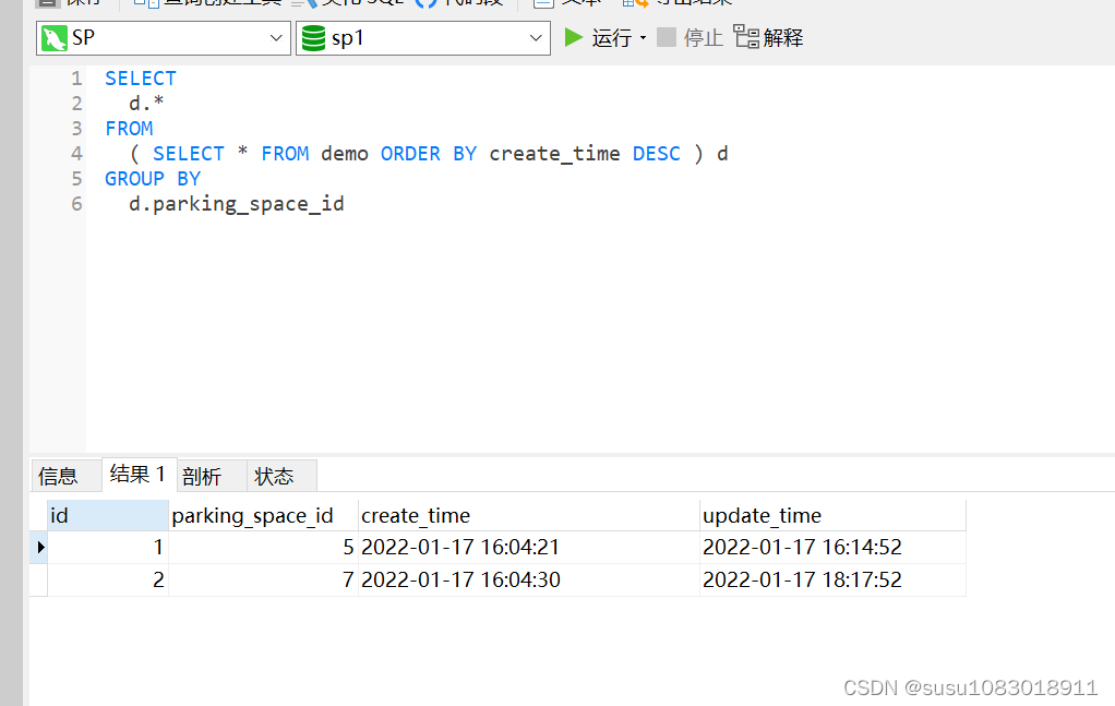 表的结构大概是这样,需求是,根据creat_time进行倒序排序,然后根据parking_space_id分组取出数据。