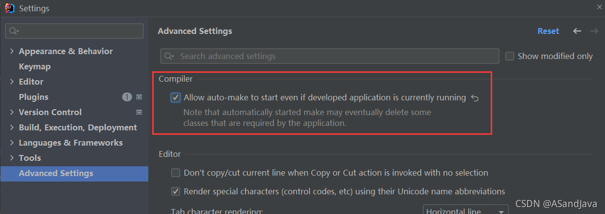 第三步 之前是使用快捷键“Ctrl+Shift+Alt+/”打开Maintenance选项框,选中并打开Registry页面。勾选compiler.automake.allow.when.app.running,之后IDEA版本变化,放入了Setting——Advanced Setting