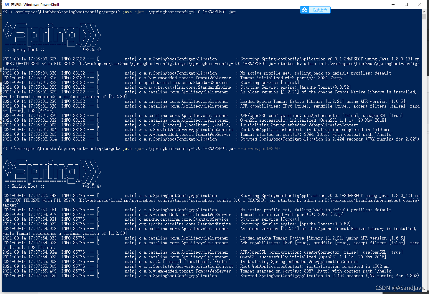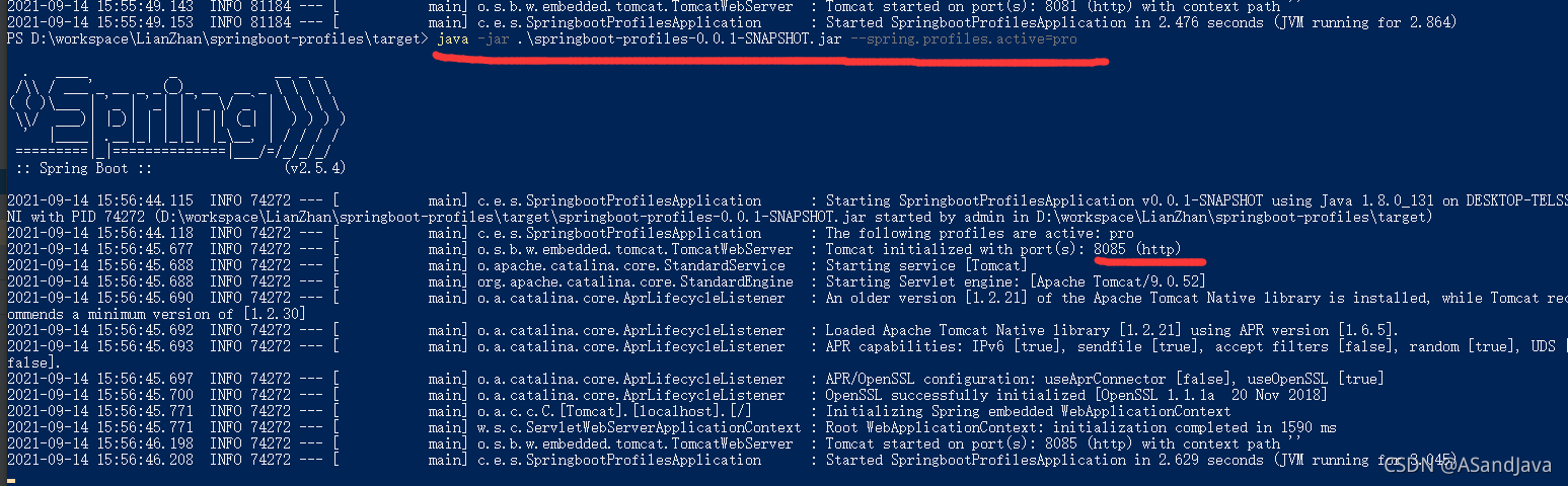 在PowerShell窗口处输入命令:java -jar .\springboot-profiles-0.0.1-SNAPSHOT.jar,点击回车